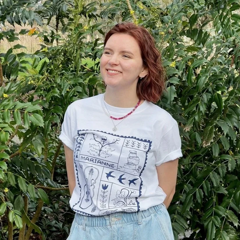 T-shirts and totebags now available with a beautiful illustrated design by a Cornwall-based artist that features all the Joyce favourites: birds, folk instruments, a Dartmoor tor, and more.